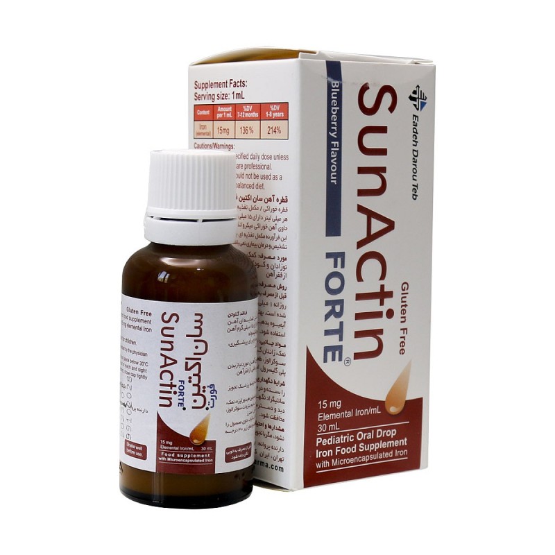 صن أكتين فورت هو مكمل حديدي بتركيبة قطرات ٣٠ مل مصمم للأطفال، يحتوي على الحديد العنصري المغلف دقيقًا. تضمن هذه التركيبة امتصاصًا عاليًا وإطلاقًا بطيئًا، مما يقلل من الآثار الجانبية الشائعة مثل تلطيخ الأسنان والانزعاج الهضمي. تجعل نكهة التوت الأزرق اللذيذة المنتج جذابًا للأطفال، مما يشجع على الاستخدام المنتظم. خالٍ من الغلوتين، الكحول، السكر، اللاكتوز، والألوان الصناعية، وهو مناسب للأطفال من عمر ٤ أشهر وما فوق.