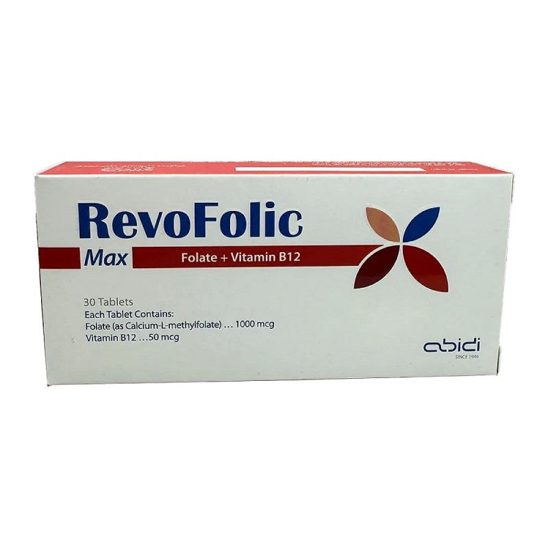 Revofolic Max is a dietary supplement designed to provide high doses of folic acid and vitamin B12. Manufactured by Abidi, this product is ideal for individuals looking to supplement their diet with essential nutrients. Each box contains 30 tablets, each providing 1000 mcg of folate (as Calcium-L-methylfolate) and 50 mcg of vitamin B12 (Cyanocobalamin).