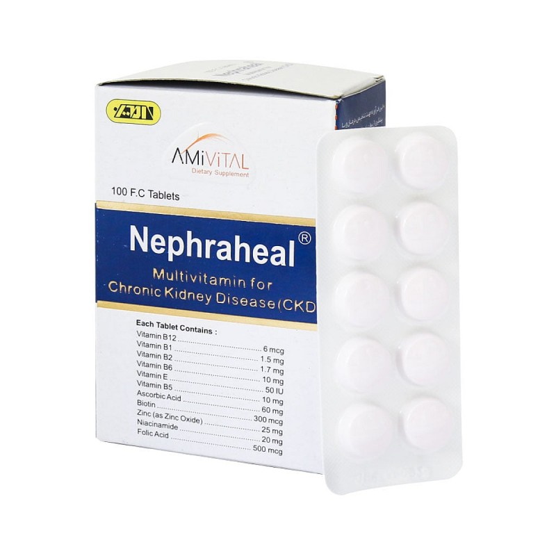Nephraheal is a specialized multivitamin formulated for individuals with chronic kidney disease, diabetic nephropathy, and dialysis patients. Manufactured by Ami Vital in Iran, this supplement contains 100 tablets packaged in 10 blisters of 10 tablets each.