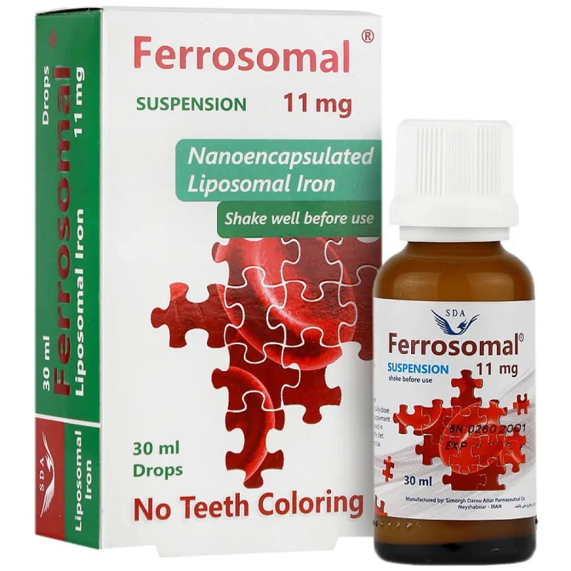 Ferrosomal Drops provide iron in a liposomal form, ensuring better absorption and minimal gastrointestinal side effects. Ideal for infants and children, these drops help prevent iron deficiency anemia, supporting healthy growth and development. The iron is encapsulated in a phospholipid membrane, allowing it to pass through the stomach directly to the intestines for optimal absorption. This formulation minimizes contact with the gastrointestinal lining, reducing common side effects like nausea and stomach pain. Additionally, Ferrosomal Drops do not stain teeth, making them a preferred choice for parents. Manufactured by Simorgh Darou Attar, this product is a reliable solution for maintaining adequate iron levels in children and adults alike.